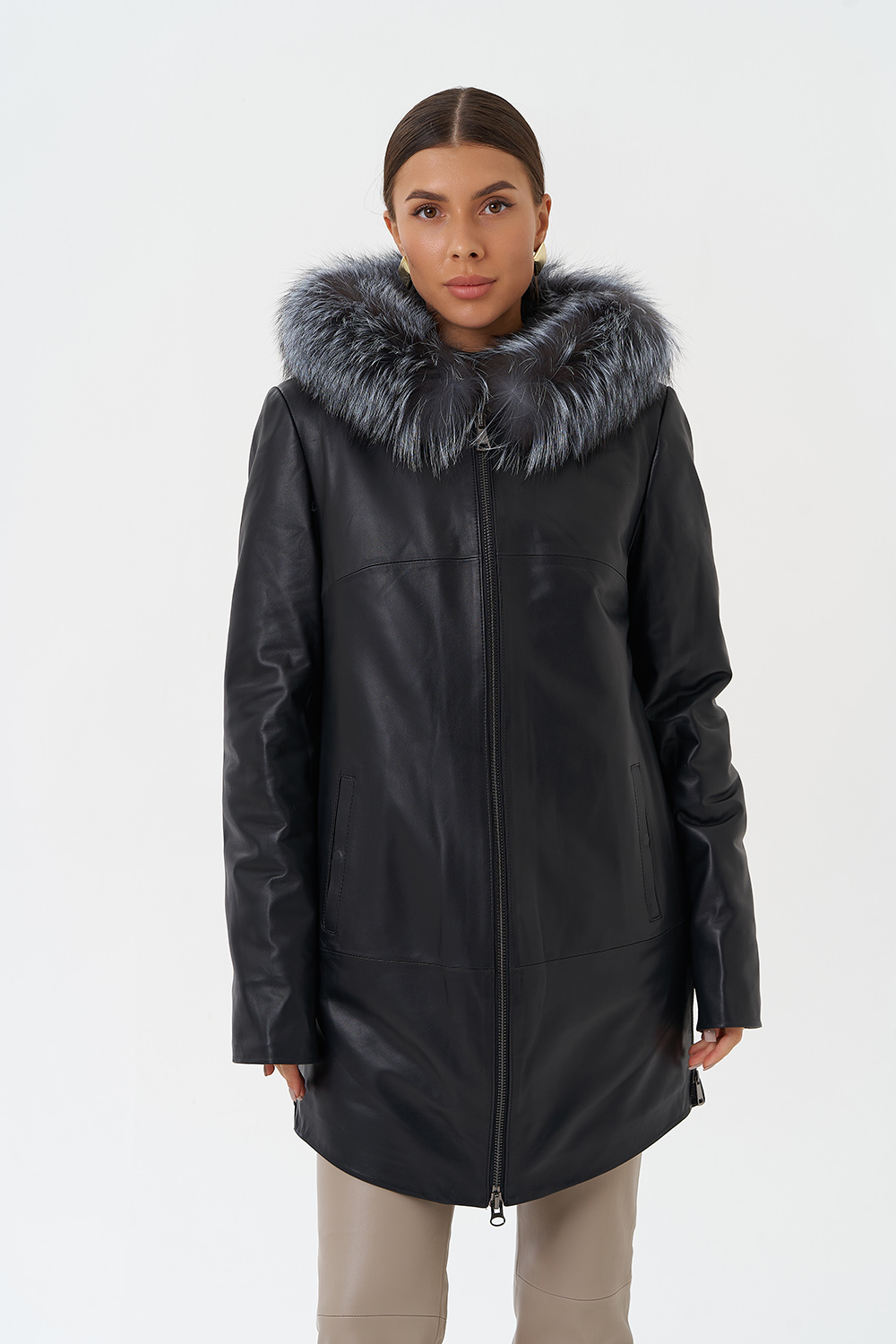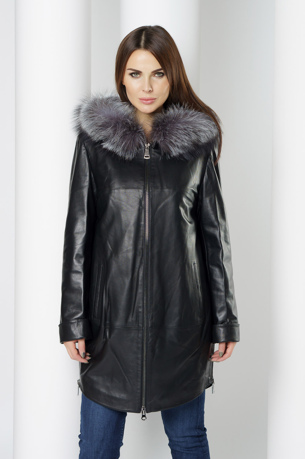 Утепленное пальто из натуральной кожи украсит ваши дождливые будни. Капюшон с отделкой из меха чернобурки согреет в ветреную погоду. Удобный фасон позволит совершать длинные прогулки. Утеплитель обеспечит комфортное пребывание на улице. С помощью молний по бокам изделия вы можете отрегулировать низ модели.