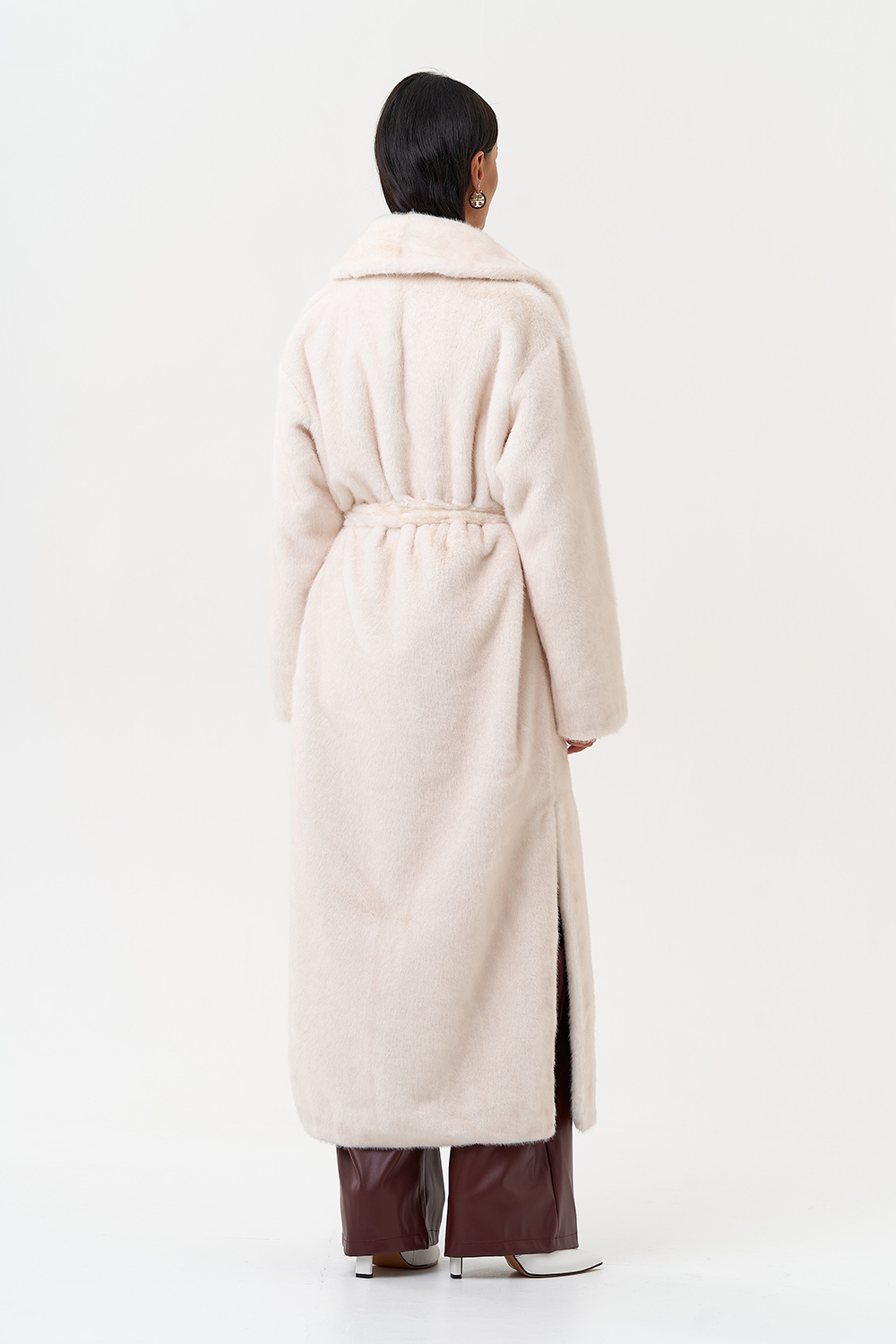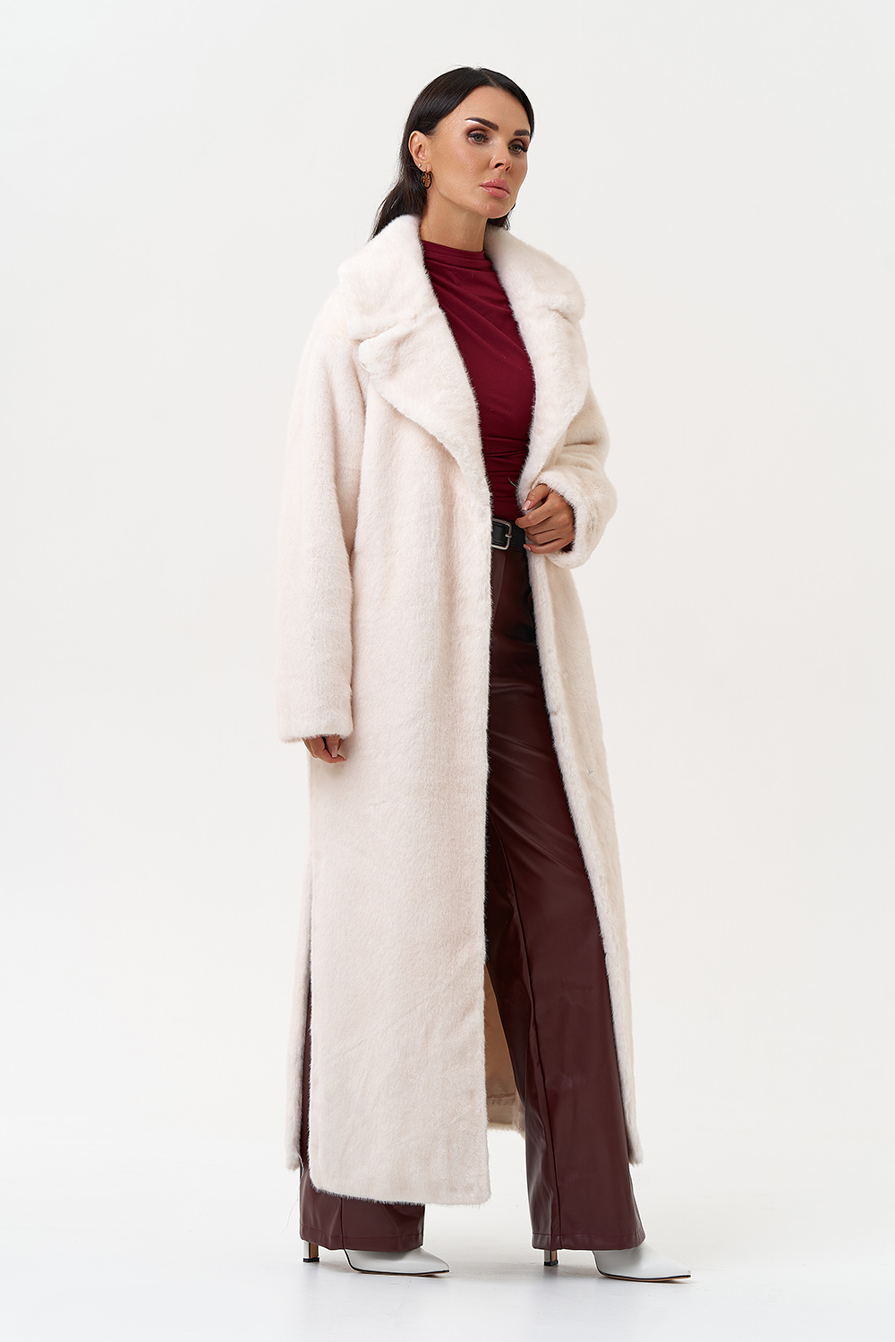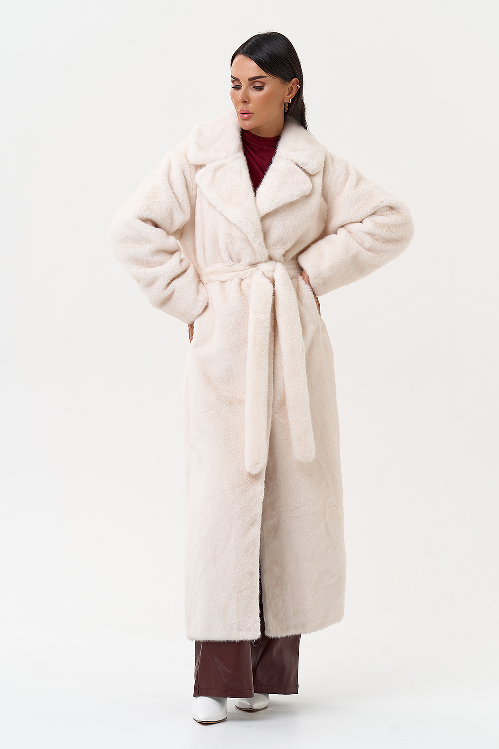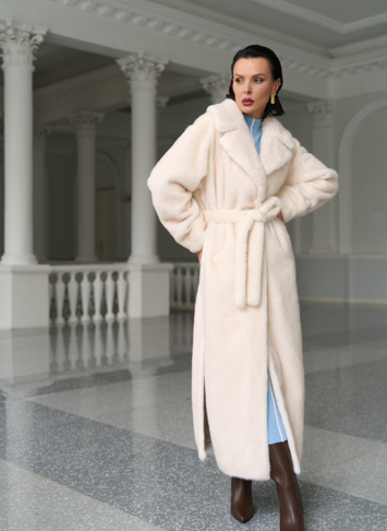 Фасон - прямой Длина изделия - 130 см Цвет - светло-бежевый (молочный) Материал - экомех Состав полотна - полиэстер 100% Подкладка - полиэстер 100% Вид застежки -крючки, пояс Вид ворота - английский воротник Фасон рукава - втачной, длинный |